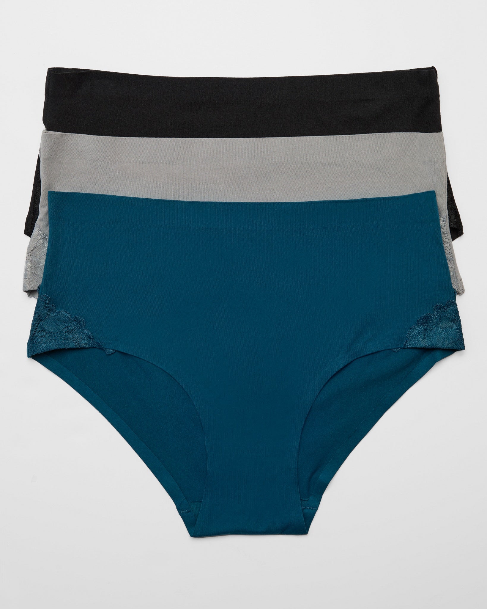 Smooth your silhouette with these everyday panties! Full coverage with gorgeous lace details. Easy to wear under your daily looks in a breathable, stretchy knit. Pack of three.