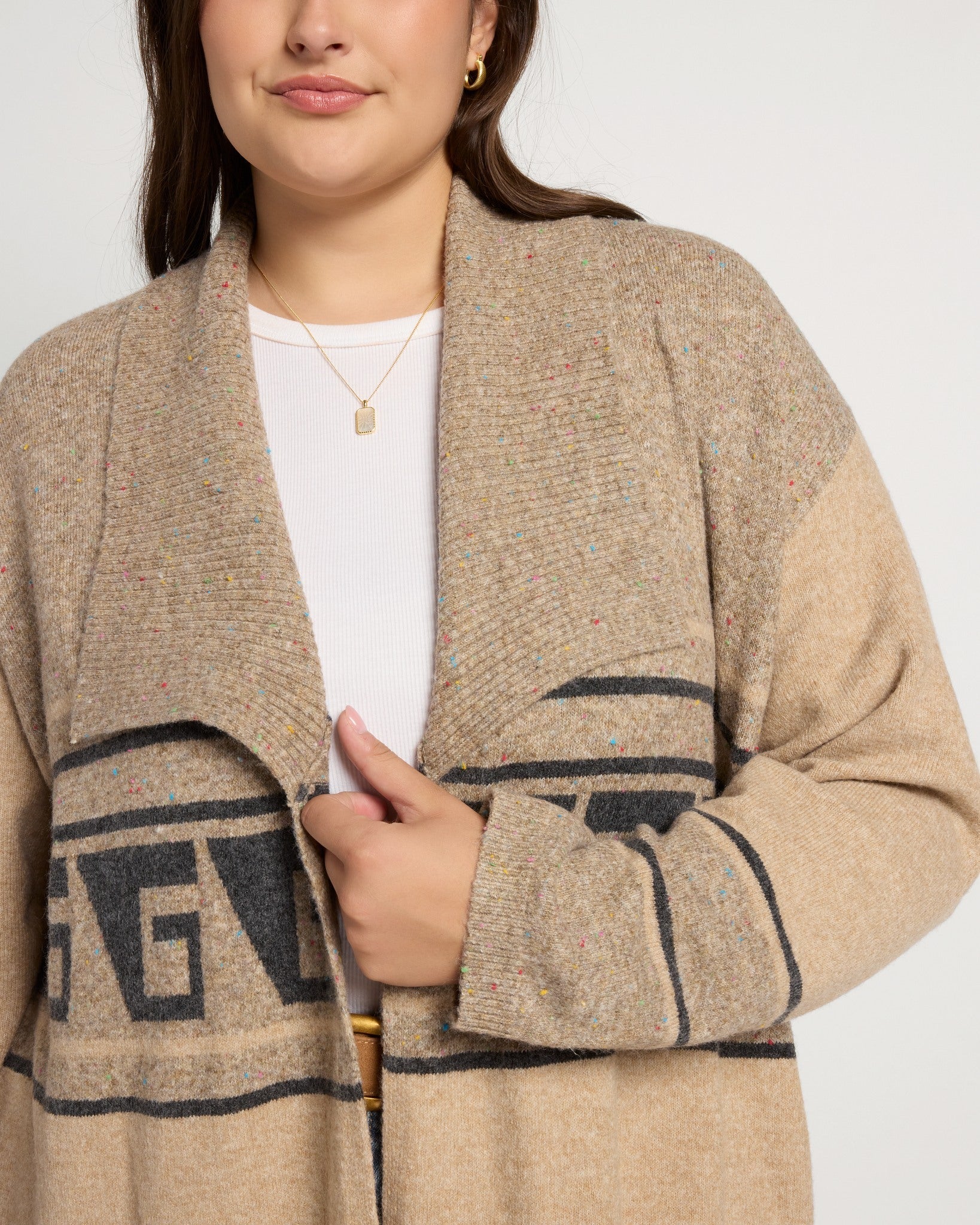 Long, luxe, and full of boho spirit. This shawl-collar duster brings major Western vibes with its soft knit, flowy fit, and Aztec-inspired geo pattern. Pair with denim and boots and go chase the horizon.
