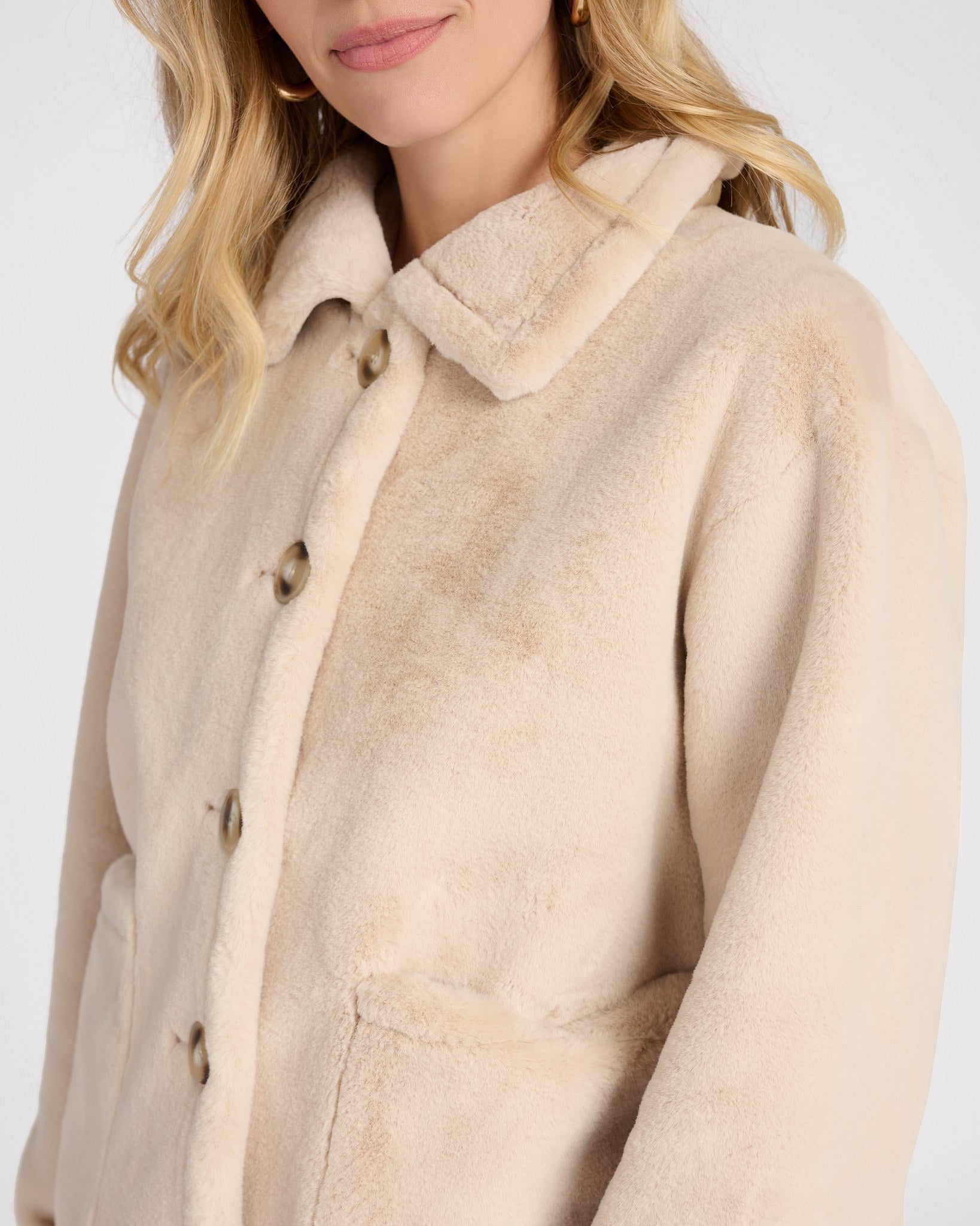 Clap back at the cold with class in this faux fur jacket! Relaxed shacket silhouette with a button-up front and two oversized pockets perfect for stashing essentials.