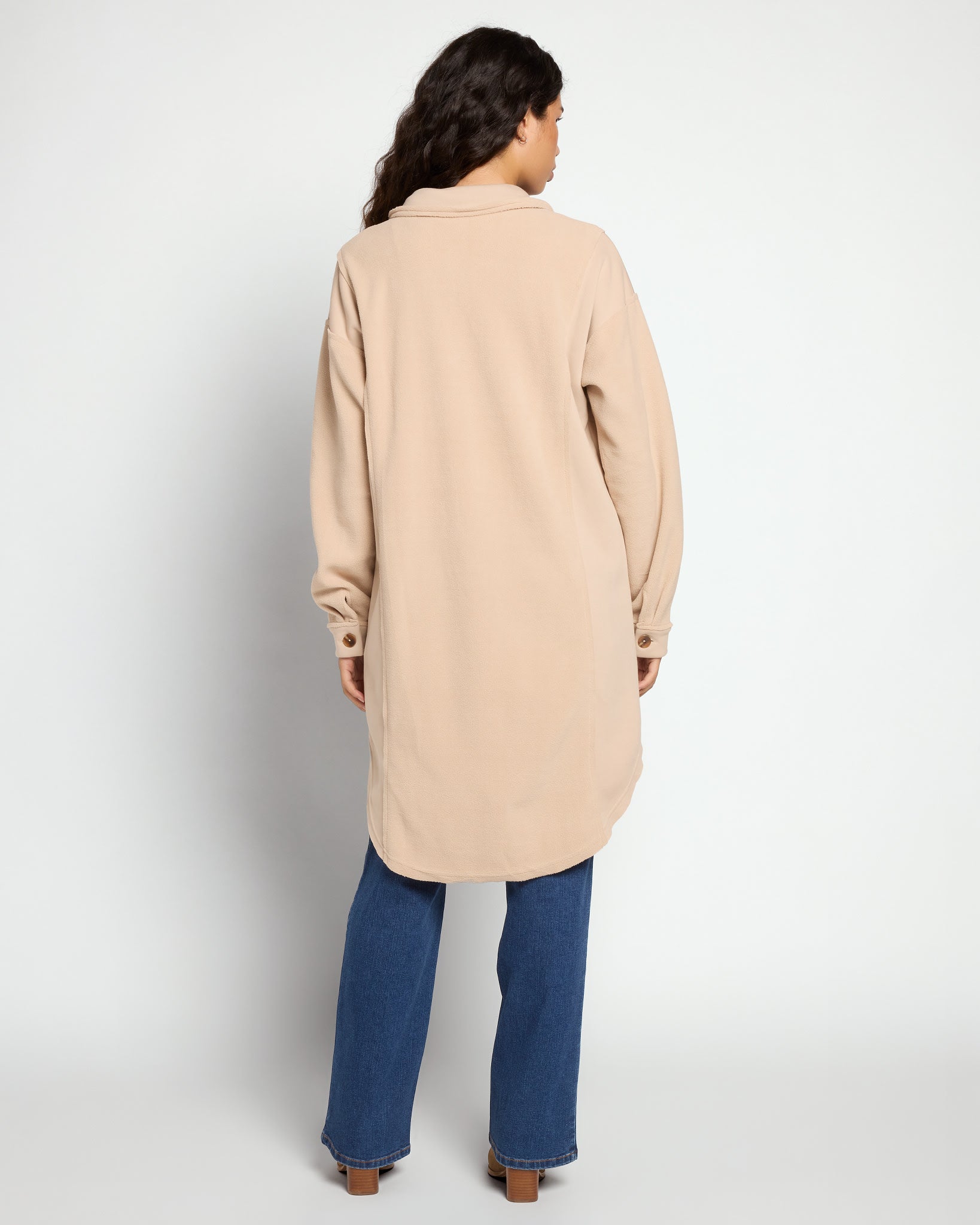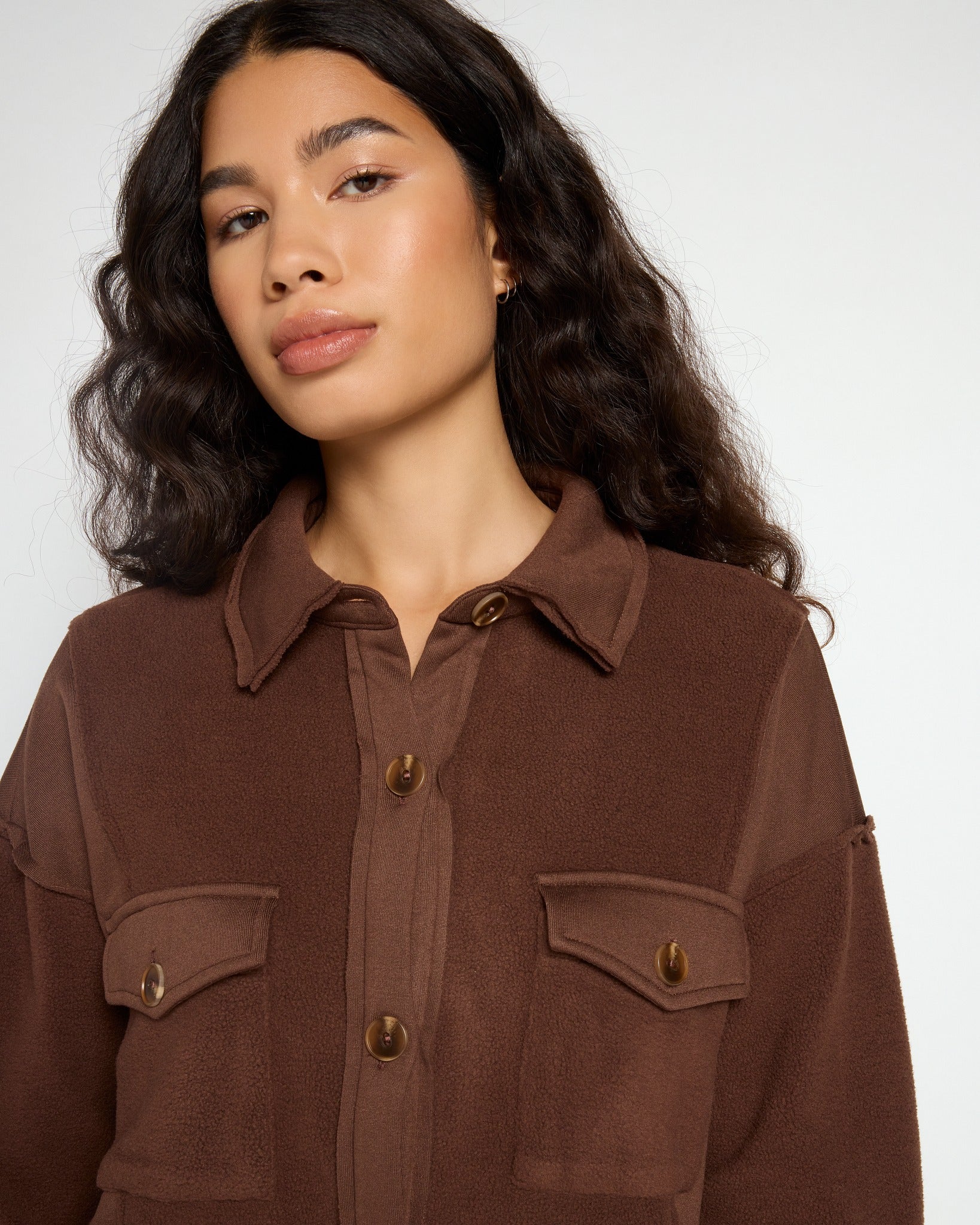 It's a shirt, it's a jacket, it's both! This shacket will bring you plenty of cozy coverage with a hip-grazing length, button-up front and functional flap pockets. Made from a flowy, stretchy knit enhanced by a rounded hem.
