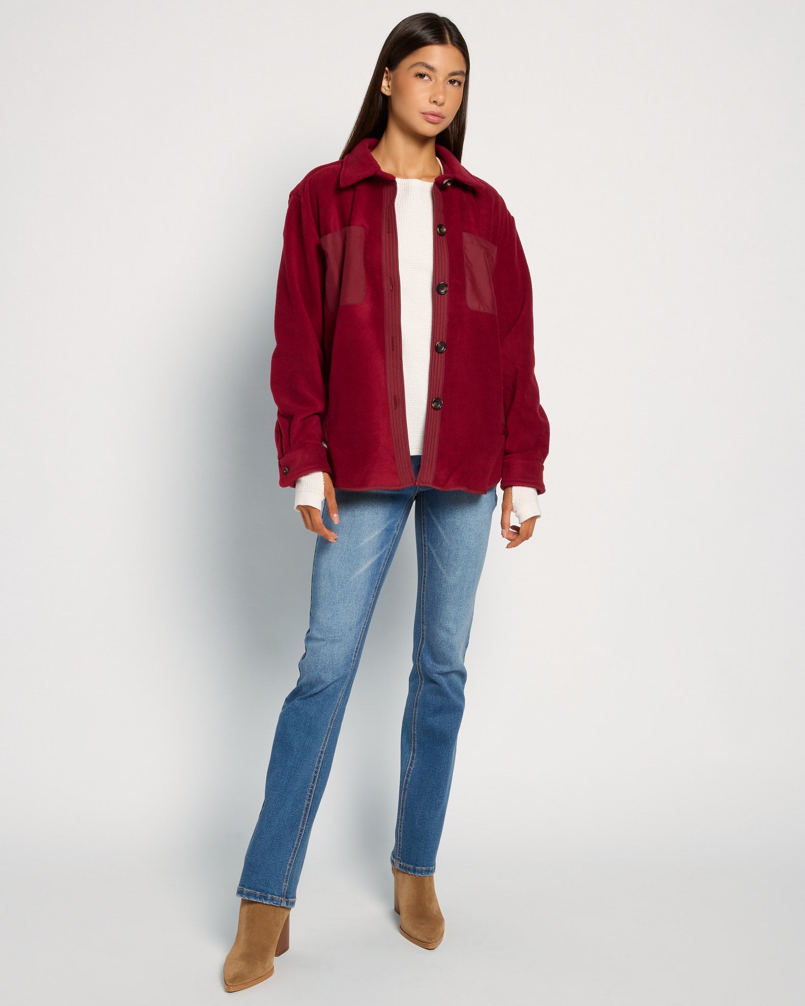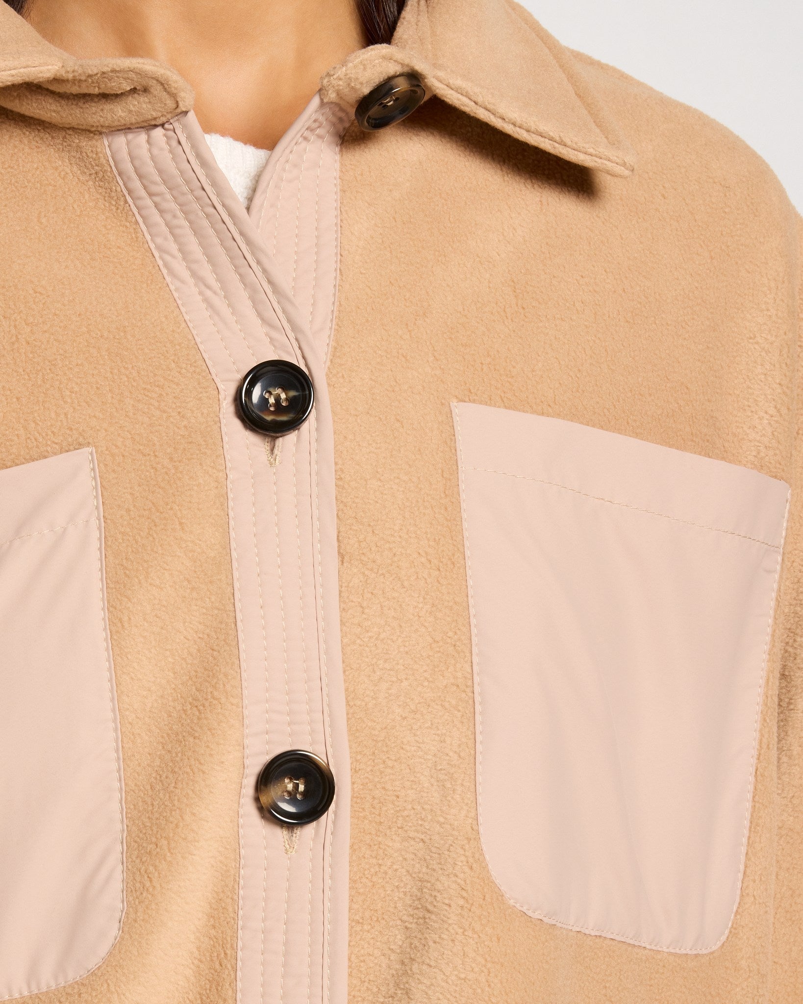 No cozy look is complete without a shacket! This one has a soft, relaxed fit that easily drapes over your everyday outfit. Button-up front with contrast patch pockets. Made to last in a durable nylon knit.