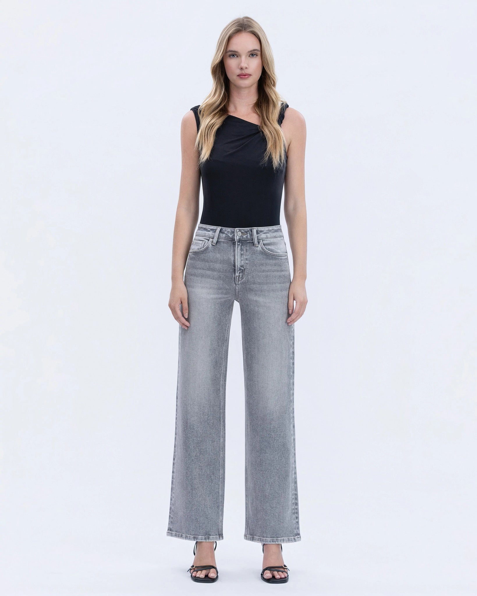Get more legroom with these wide-leg jeans! They sit high on the waist and are relaxed through the legs. So-soft and stretchy denim detailed with creases and classic five pockets.