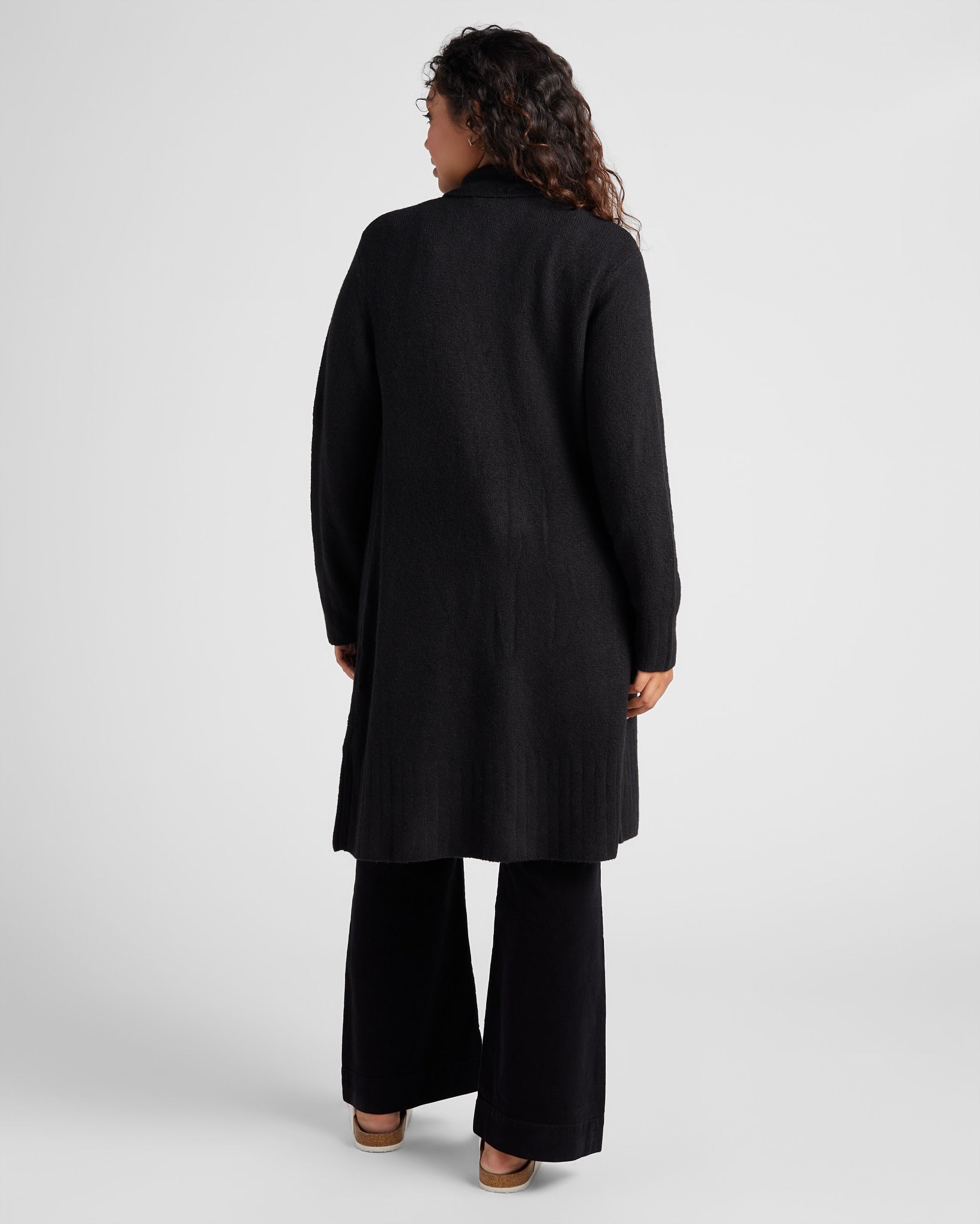 Wrap yourself in elegance with this knee-length cardigan. Open front with chic rib knit pockets, it's the perfect blend of style and snuggle.
