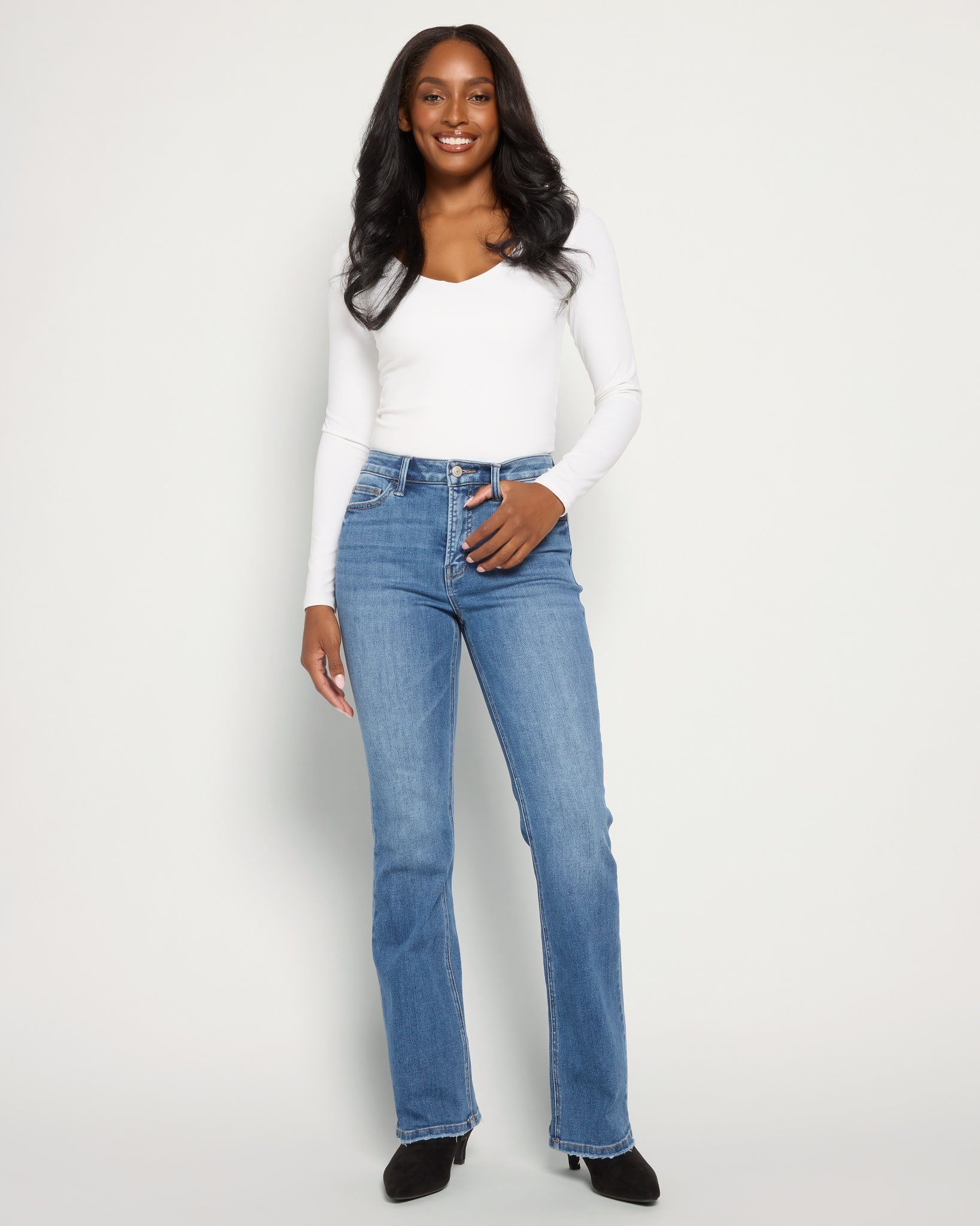 Bootcut jeans in a timeless and versatile fit! It hugs the mid-waist and flares open just enough to fit over your favorite boots. Made of ultra-soft and stretchy denim with whiskering on the legs for a worn-in look.