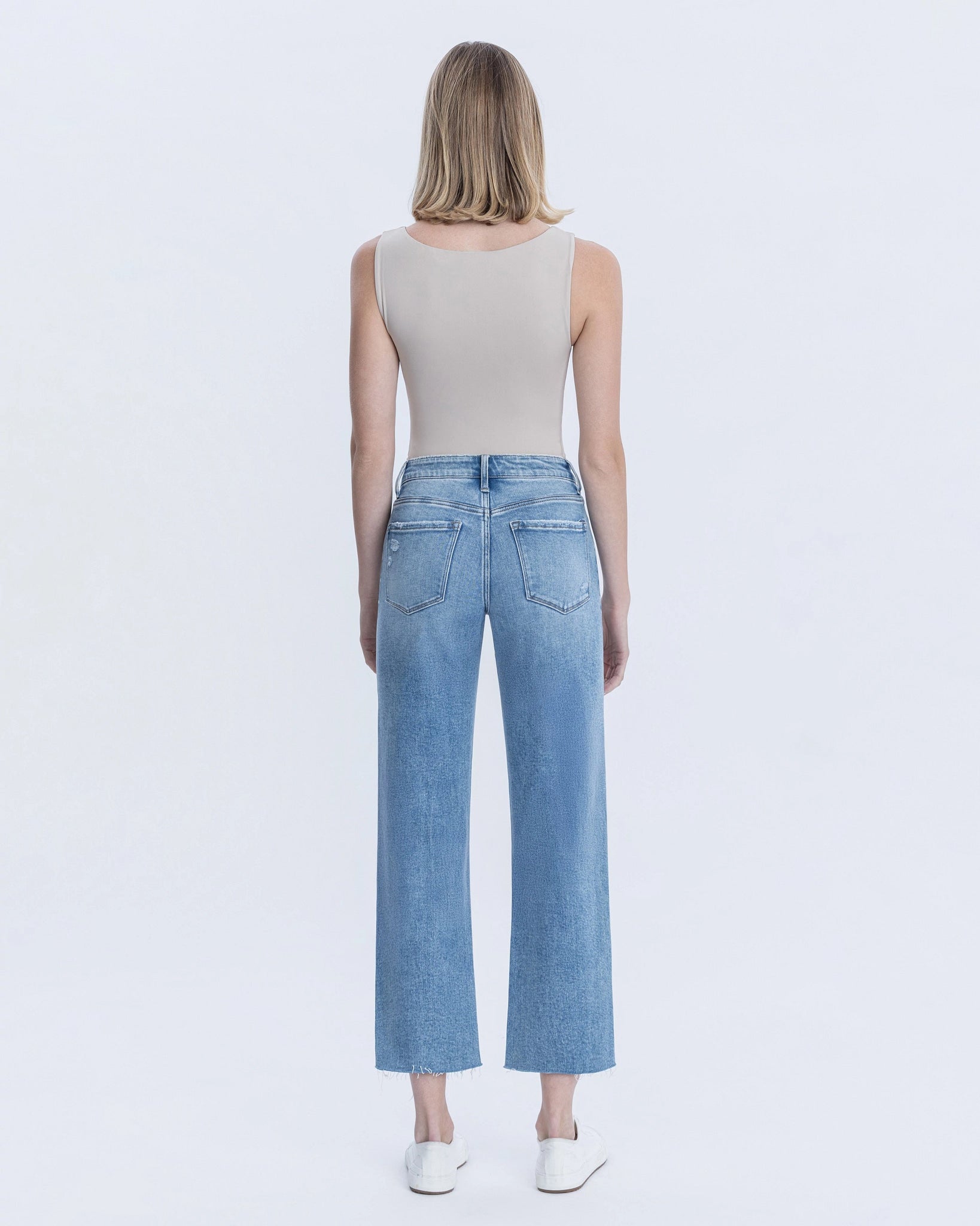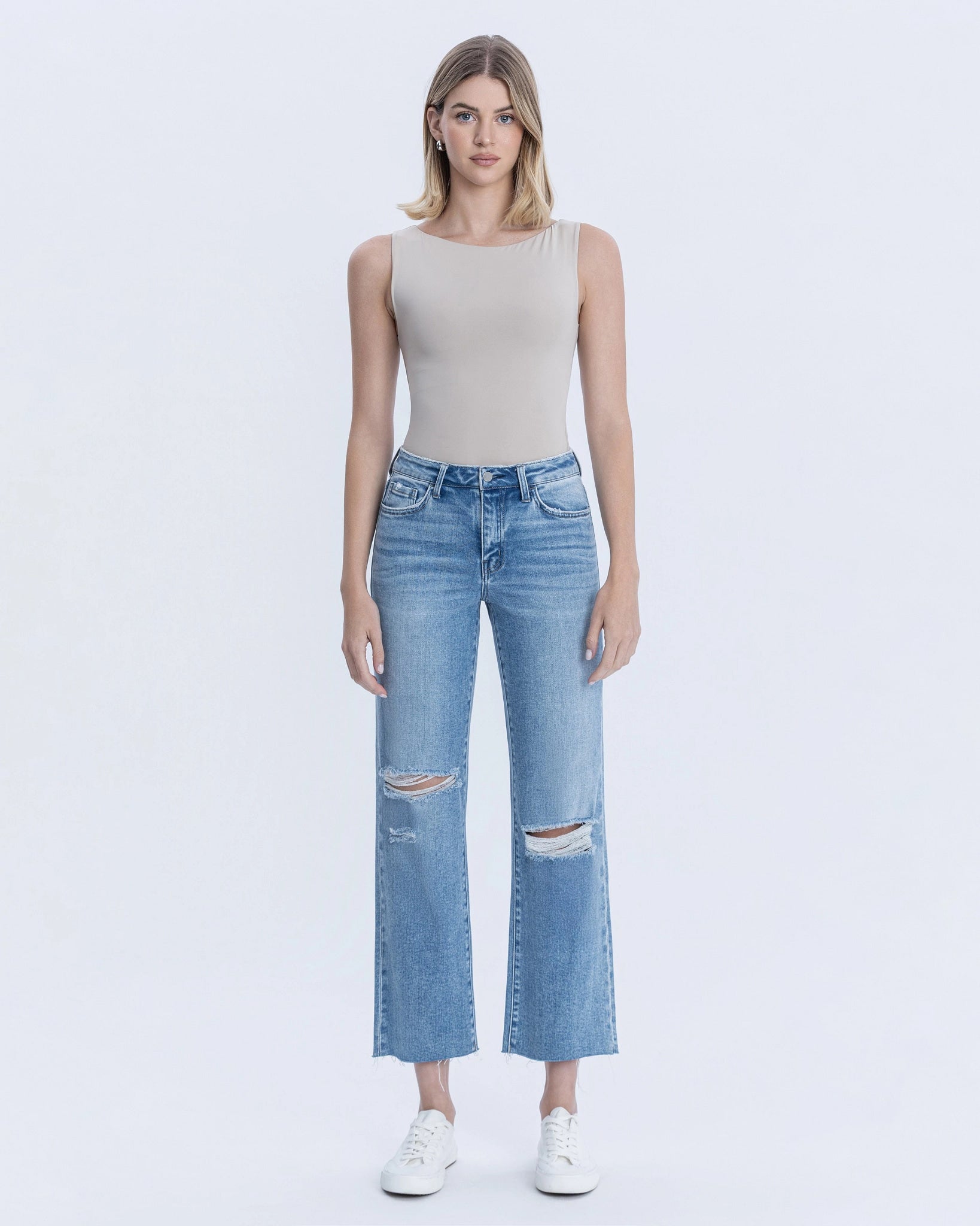 These distressed jeans are sure to be your favorite off-duty staple. Flattering slim wide-leg fit with ripped knees and a frayed hem. Made of comfy denim with just-right stretch.