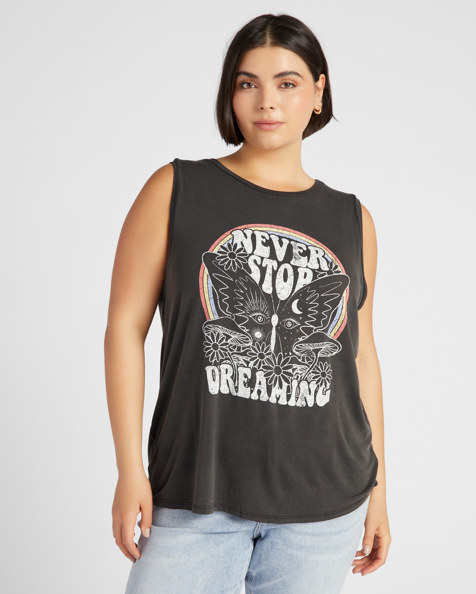 A retro-inspired tank that feels delightfully soft and stretchy. Relaxed fit with "NEVER STOP DREAMING" printed above and below a stunning butterfly print. Made from an ultra-soft stretch fabric.