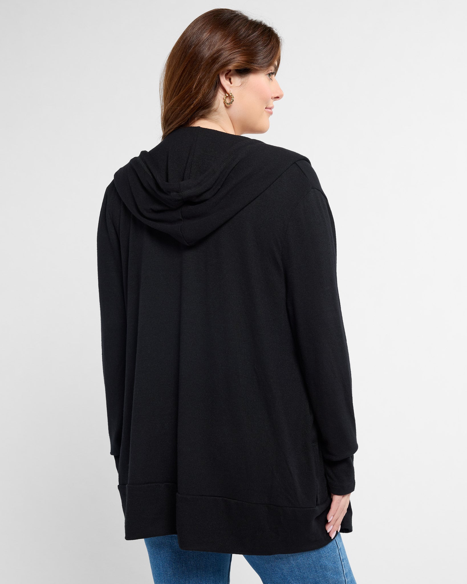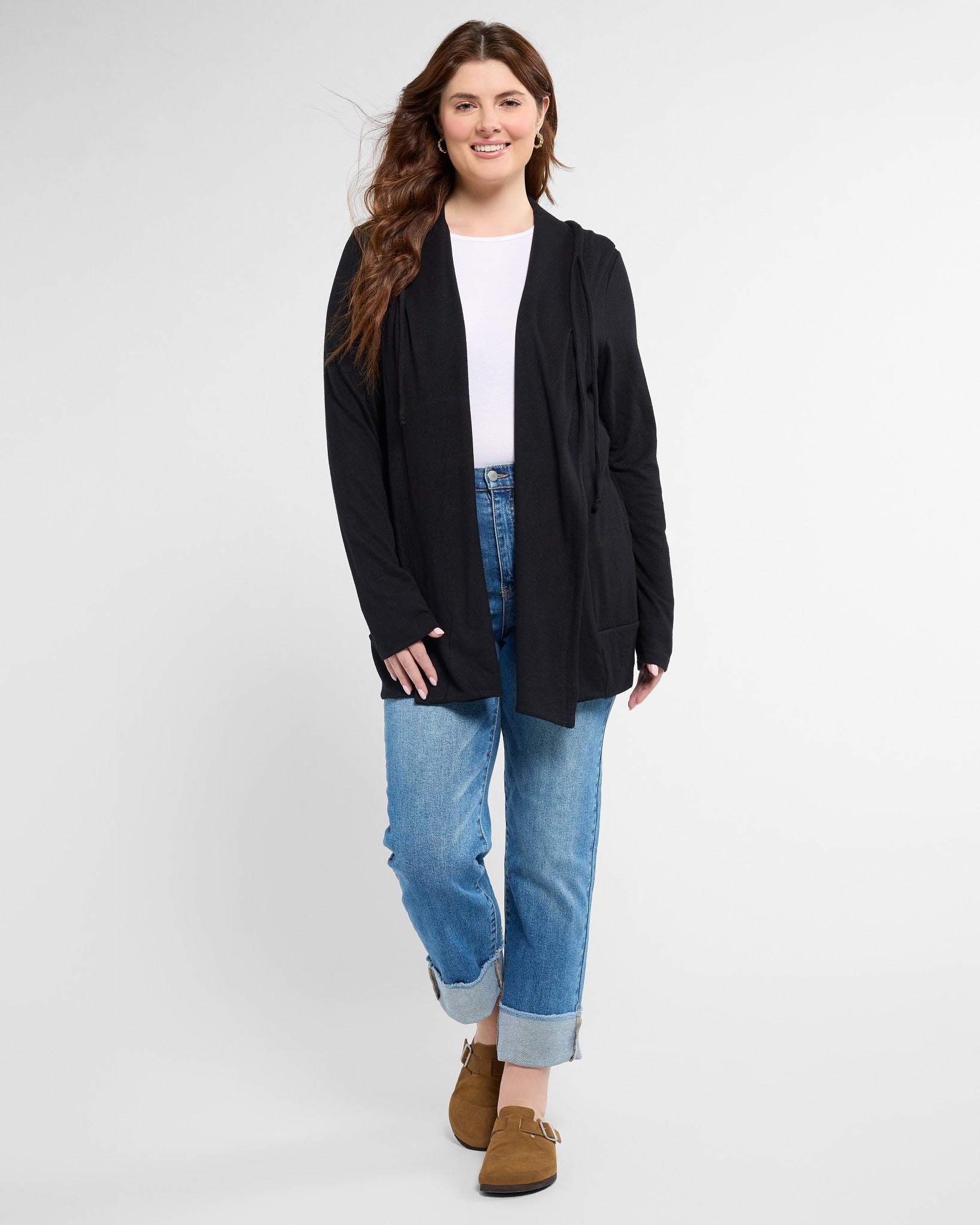 Your new favorite go-to cardigan. With its relaxed fit, breezy open front and drawstring hood, this cozy layer is perfect for easy days and laid-back nights. Made from an ultra-soft brushed fabric, complete with functional pockets.