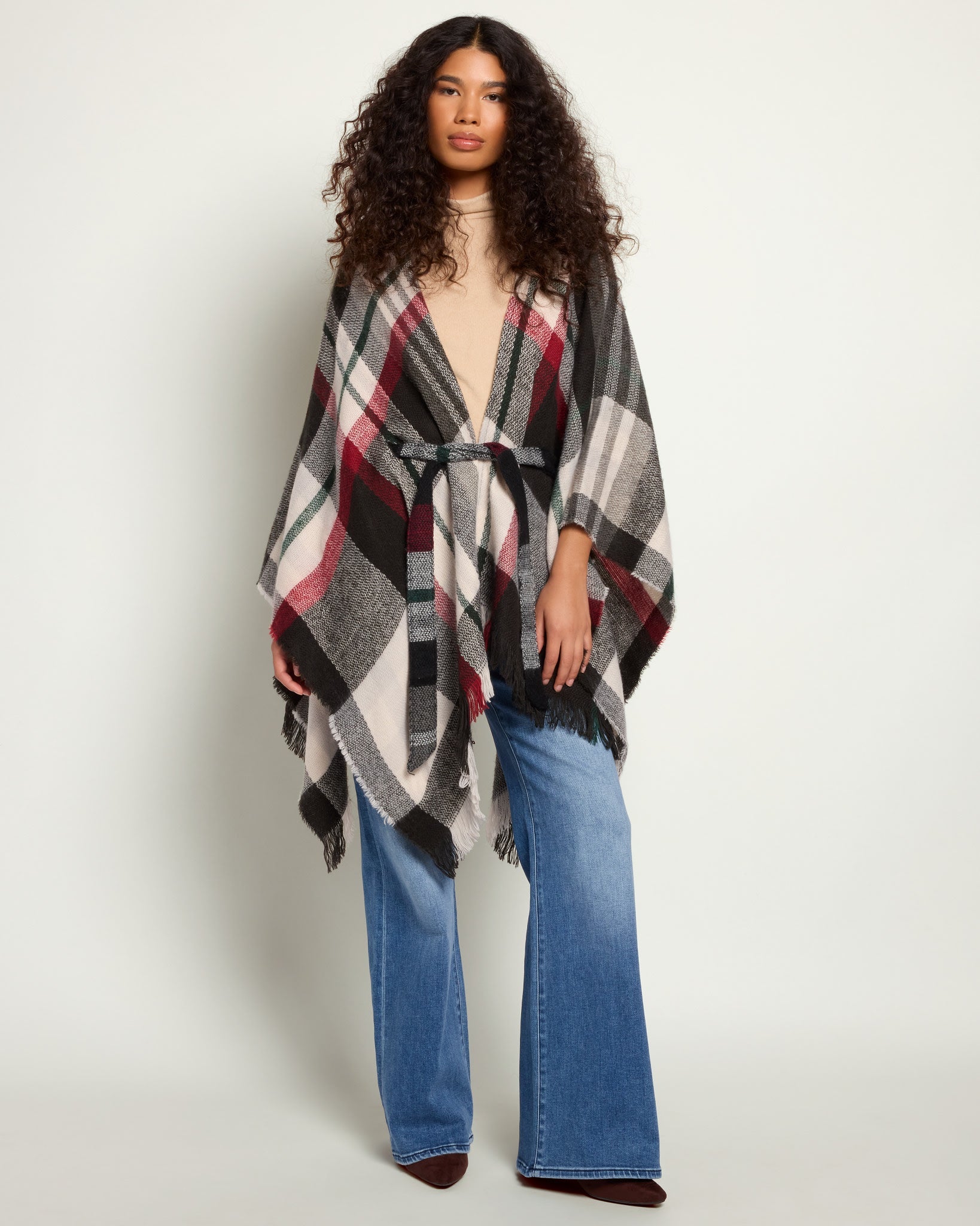 For those days you need to layer with flair, this plaid kimono wrap is the answer! Blanket scarf style with a handkerchief hemline and belted waist. Fabulously voluminous and cozy in a softly woven knit.