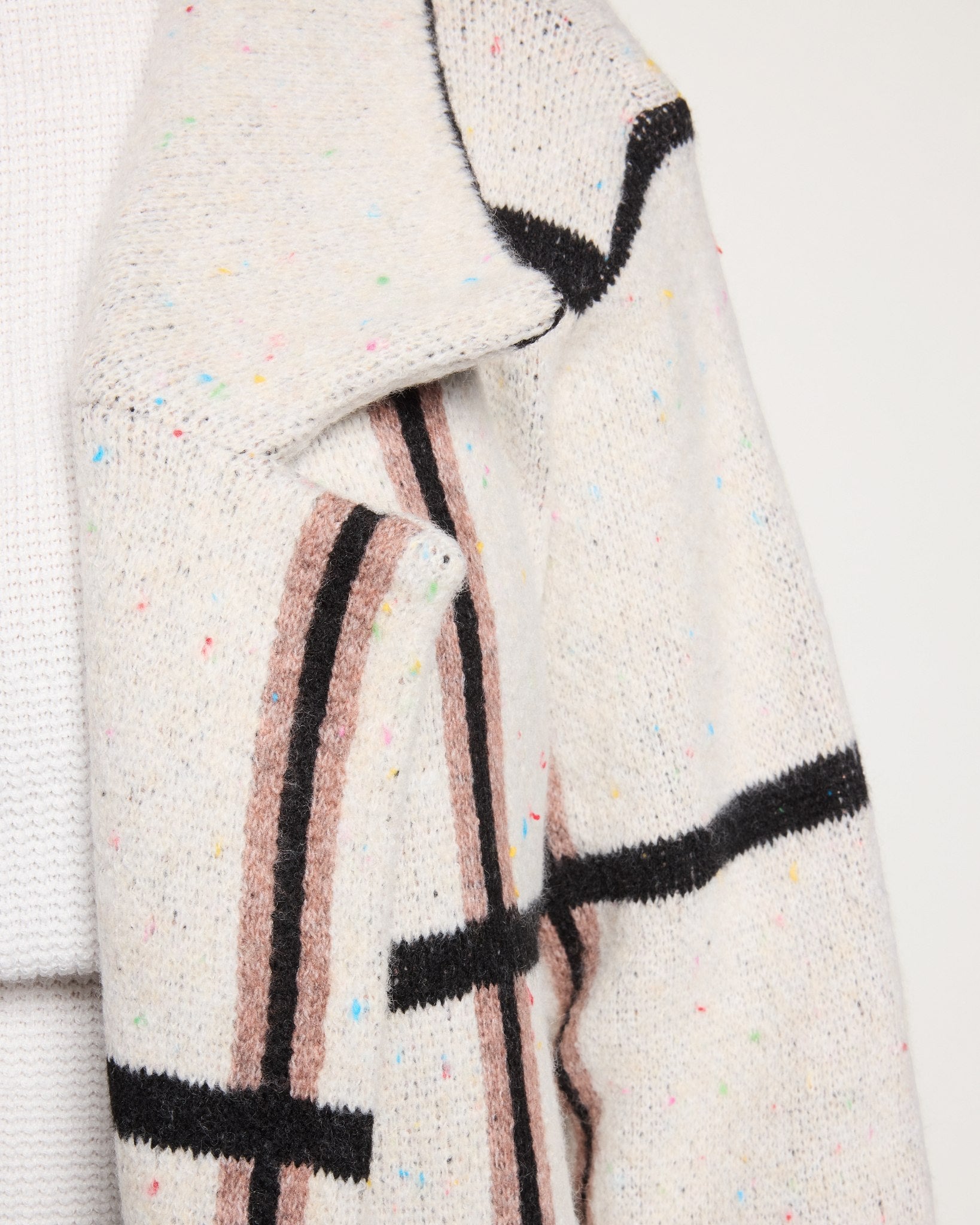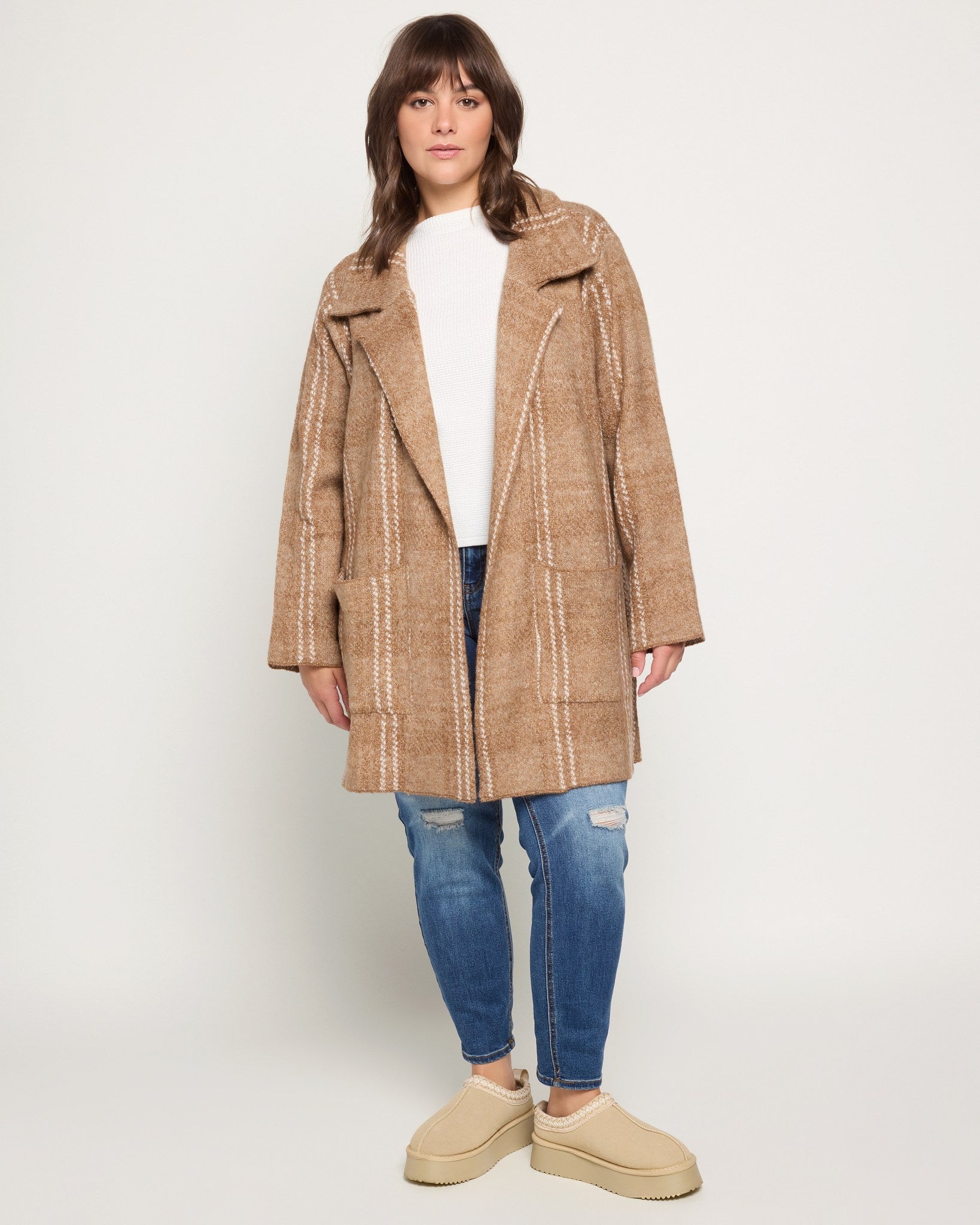 A long plaid jacket that strikes the perfect balance between comfy and chic! Open front with a cozy cardigan fit, two pockets and sharp notched lapels. Made of a so-soft knit that's easy to snuggle into.