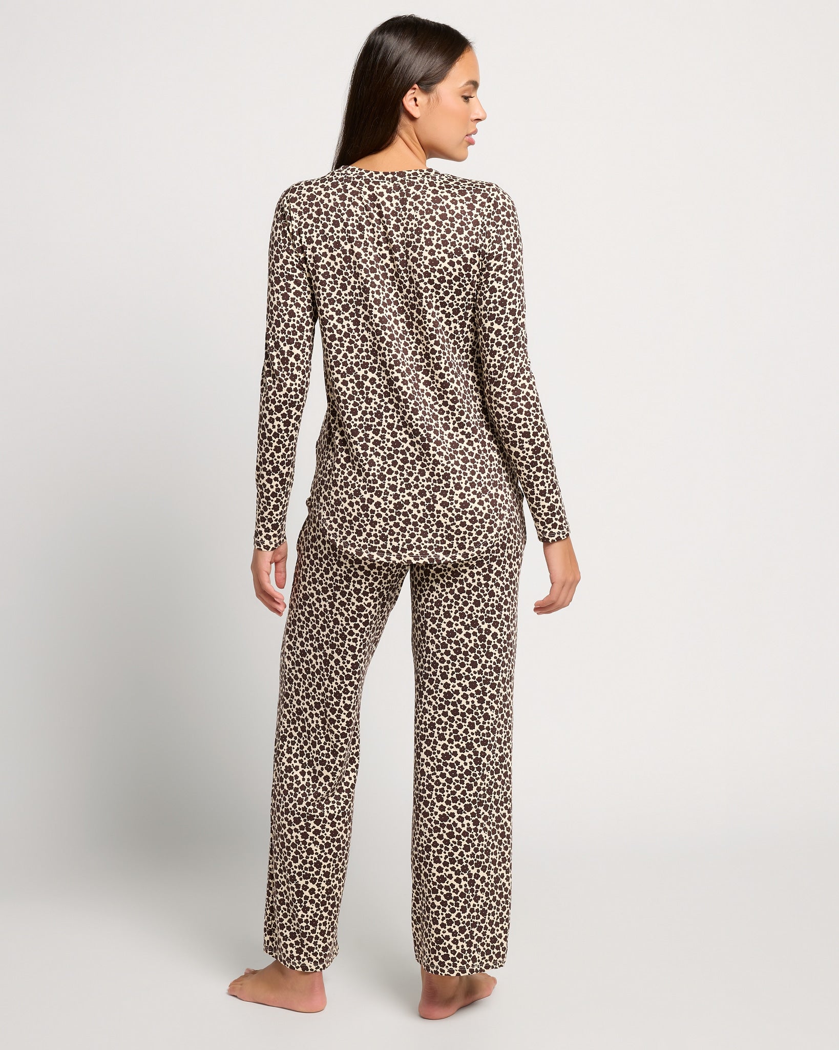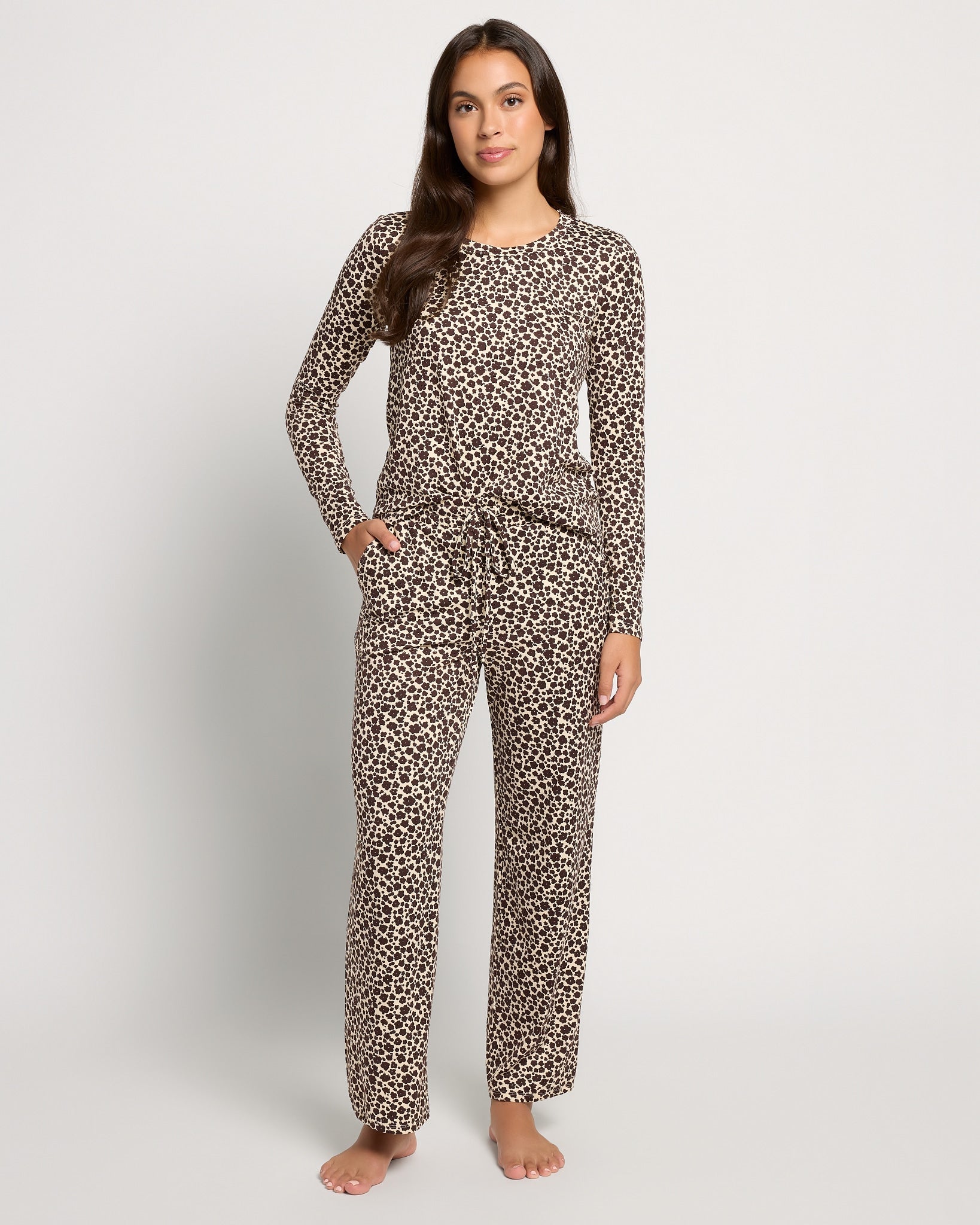 Lounge in style with this pajama set! Relaxed fit with a crew neck long-sleeve top and coordinating drawstring pants. Made of a so-soft and stretchy knit.