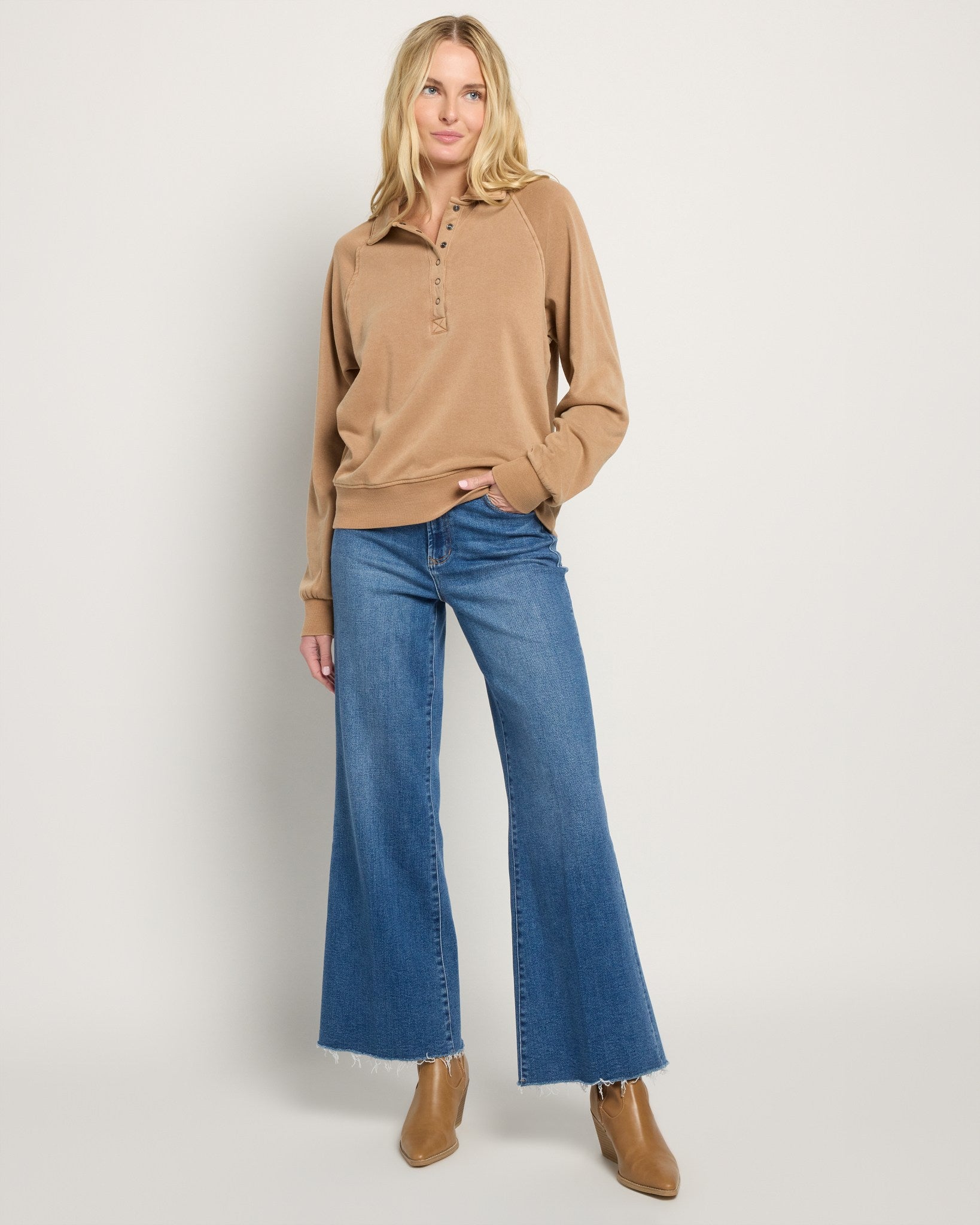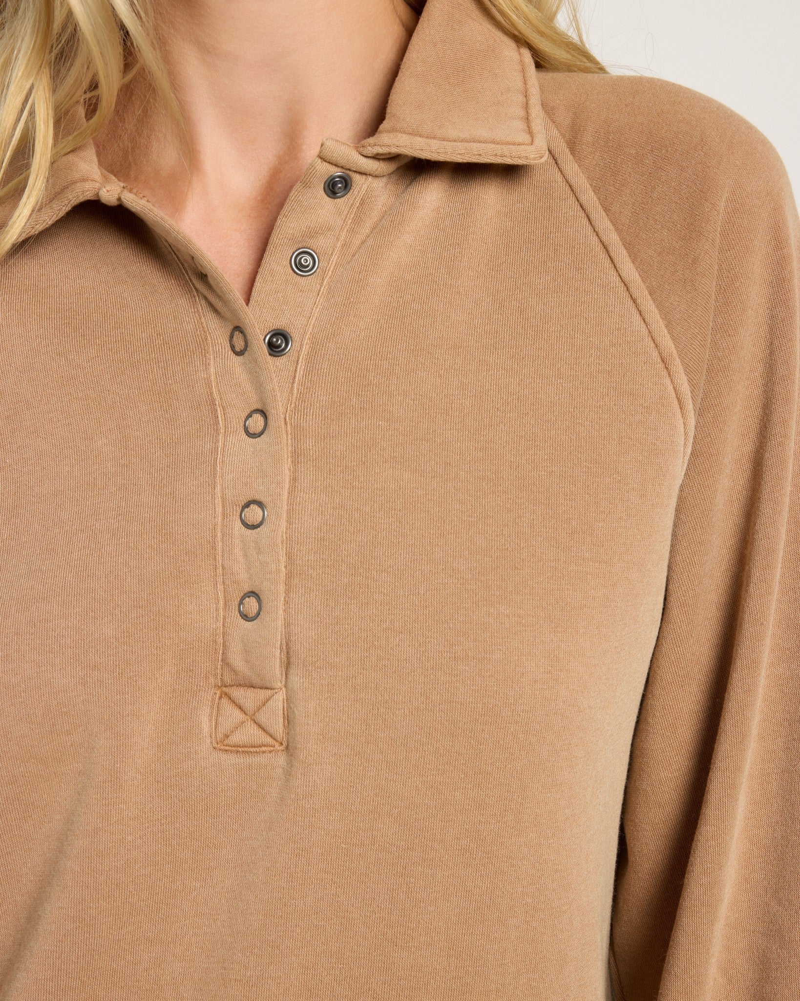 You won't be able to resist the boyish charm of this ribbed sweater! It has a loose, borrowed-from-the-boys fit with a relaxed collar, button placket, and raglan sleeves. It'll easily pair with your everyday jeans or be a chic counterpoint to a mini skirt.