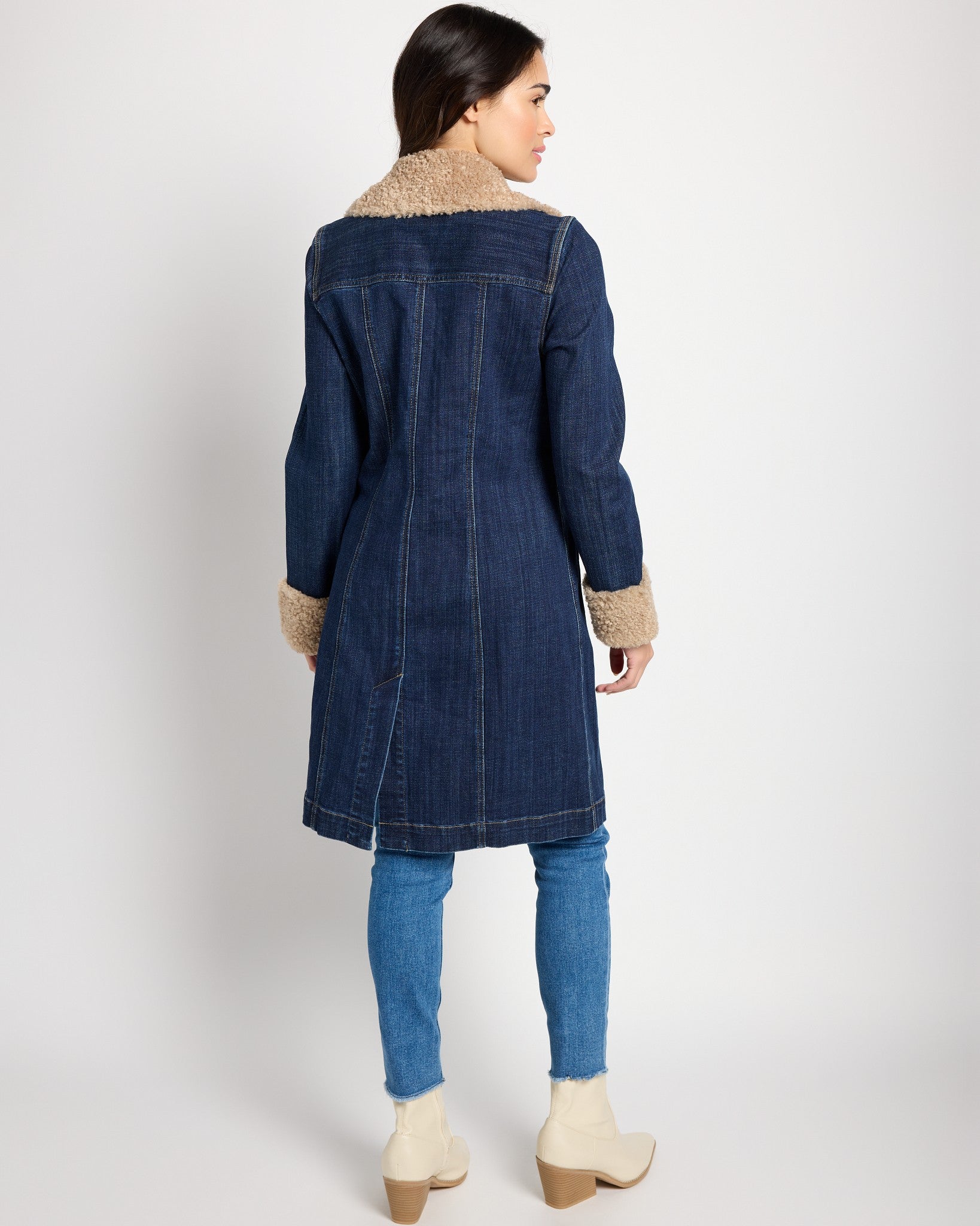 When it comes to staying toasty, this denim trench coat checks all the boxes! Sherpa collar and cuffs with front pockets and a button-up closure that ends at the knee, giving you plenty of protective coverage. Made of durable denim with the coziest sherpa lining.
