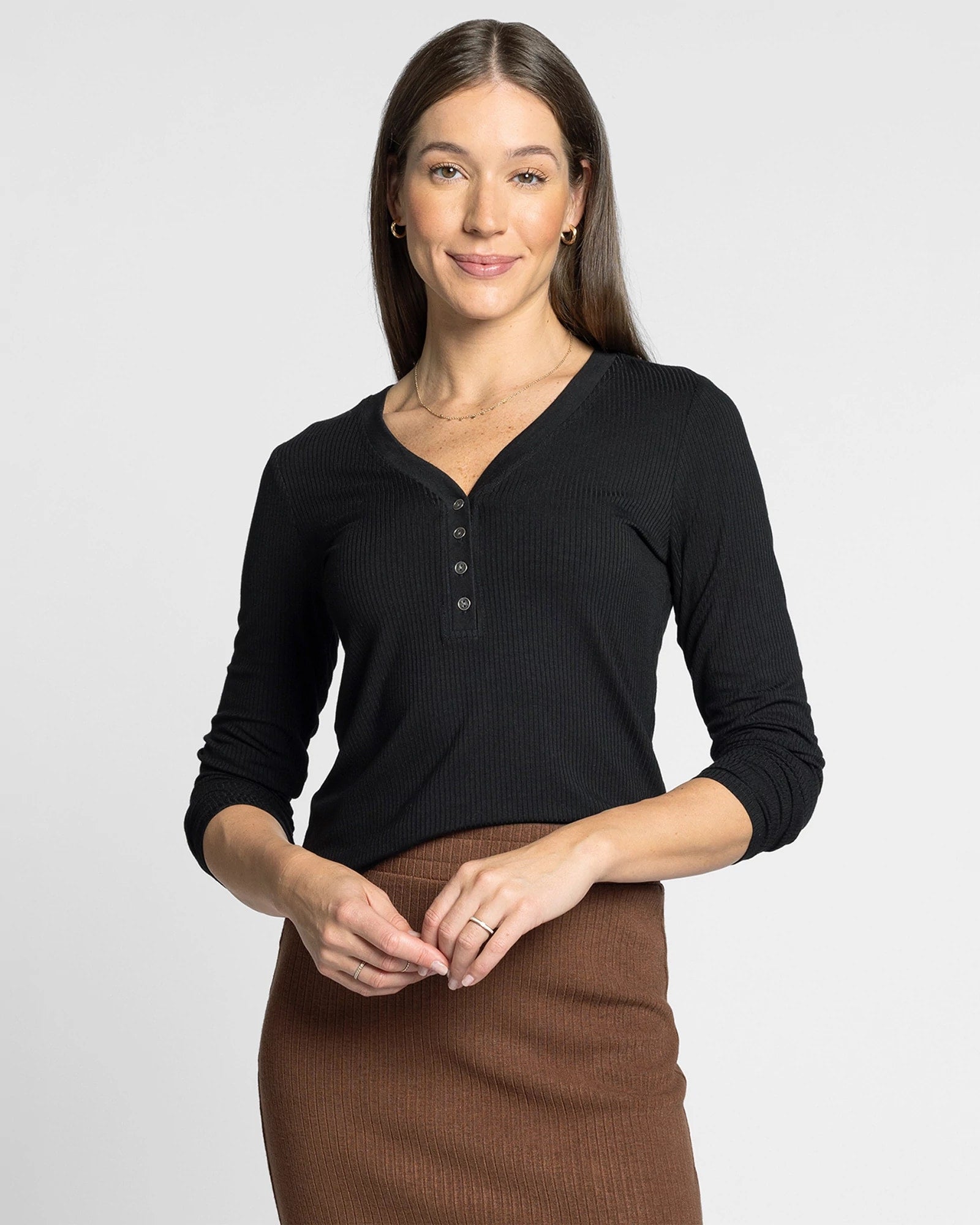 This Henley tee is perfect for those light layering days! It has a v-neckline and long sleeves for full coverage. Relaxed cut in a ribbed knit for just comfy stretch.