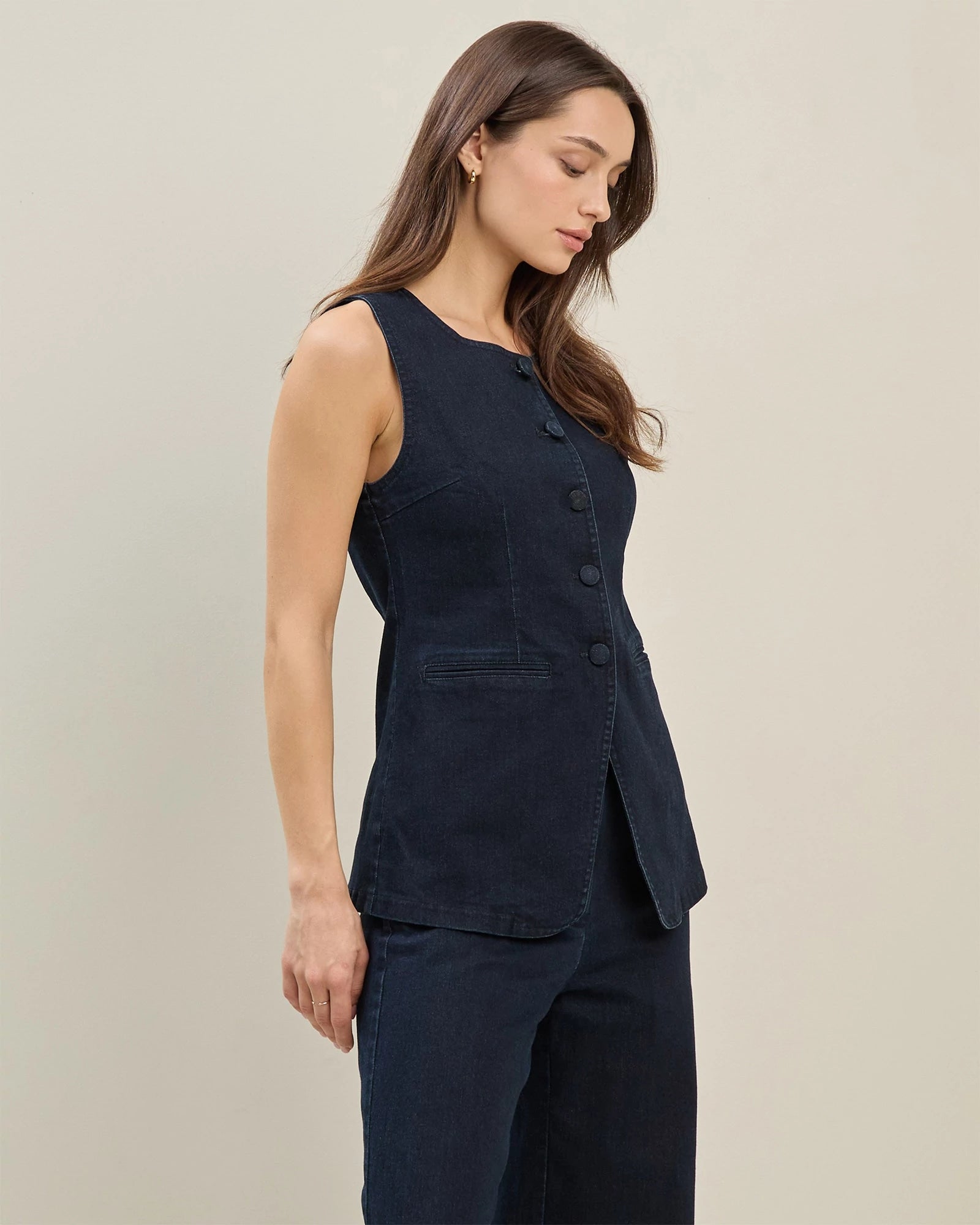 Serve looks from the waist-up! This denim vest is ultra-chic with a round neckline, tonal buttons, and a slim cut that flares out at the waist. The effortless option for looking cute on video calls or IRL!