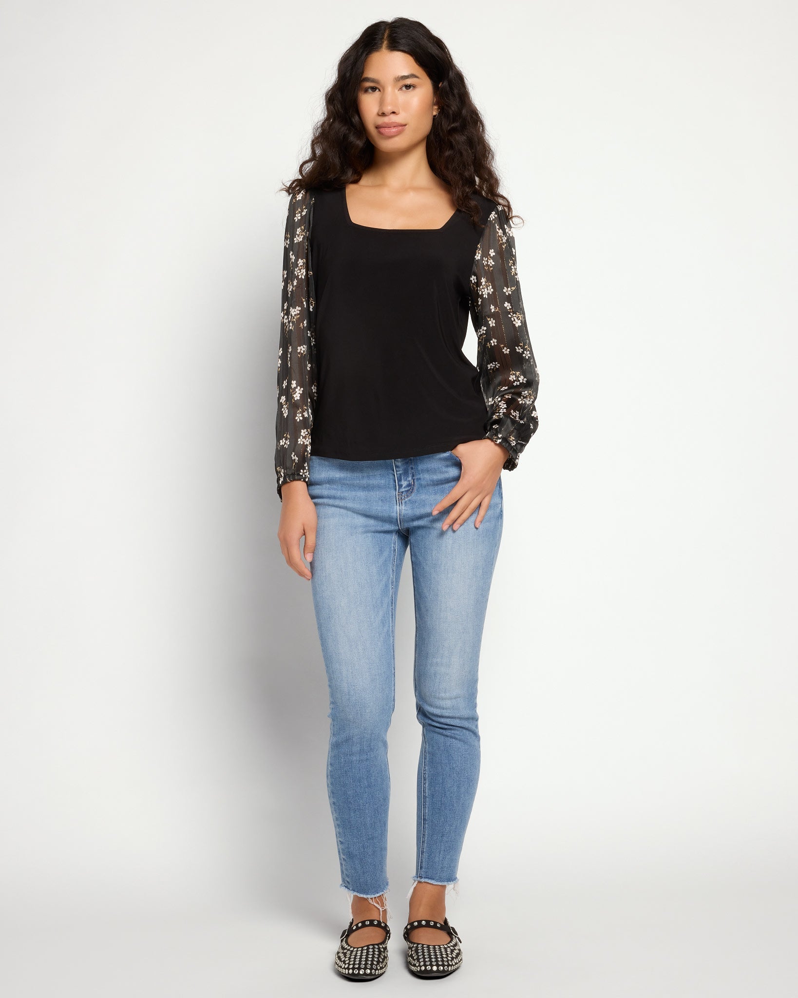Sheer floral sleeves add unexpected romance to this knit top! Slim fit with a beautiful square neckline to show off your favorite necklace stack. Perfect for day to night in a so-soft and breathable modal knit. Made in the USA.