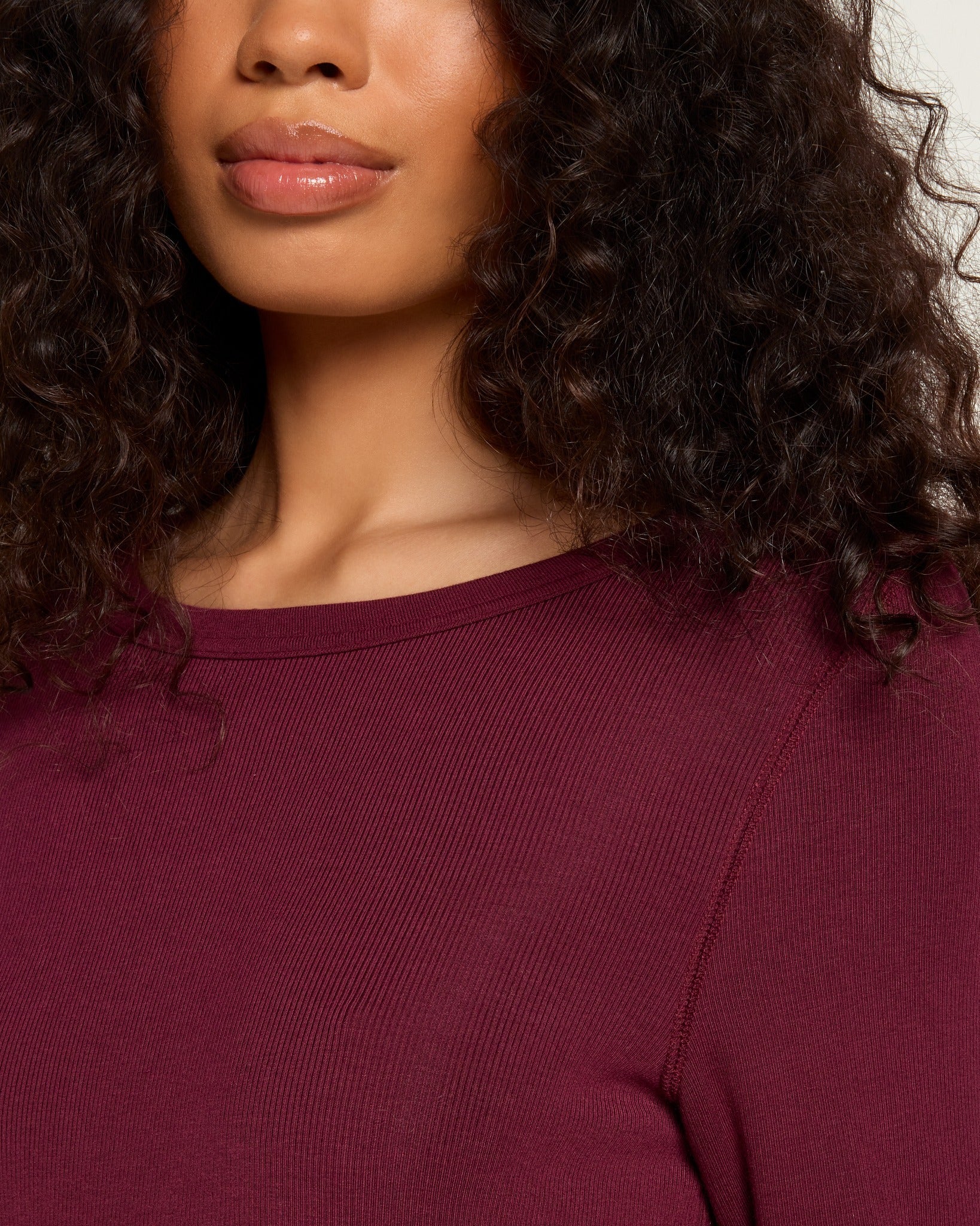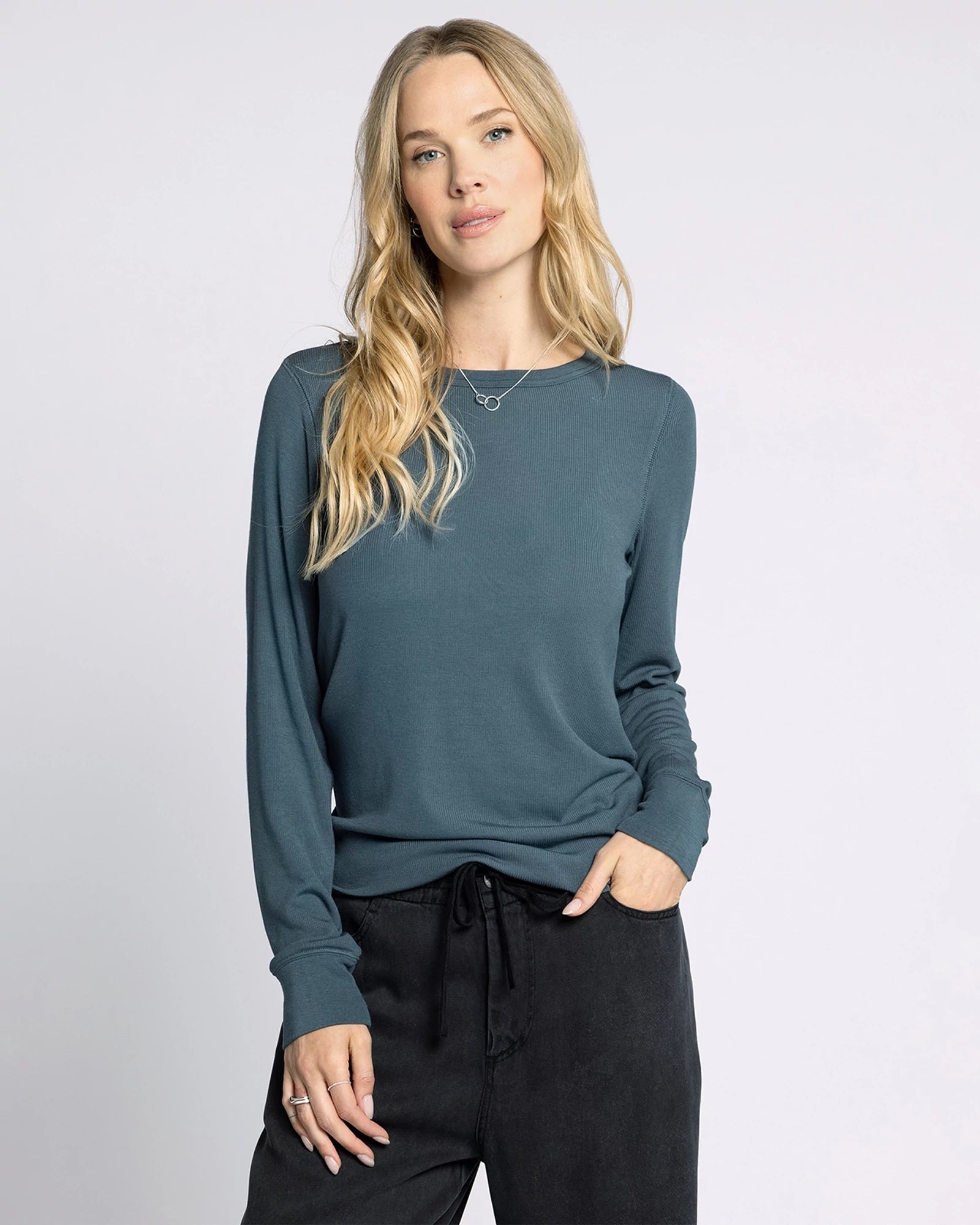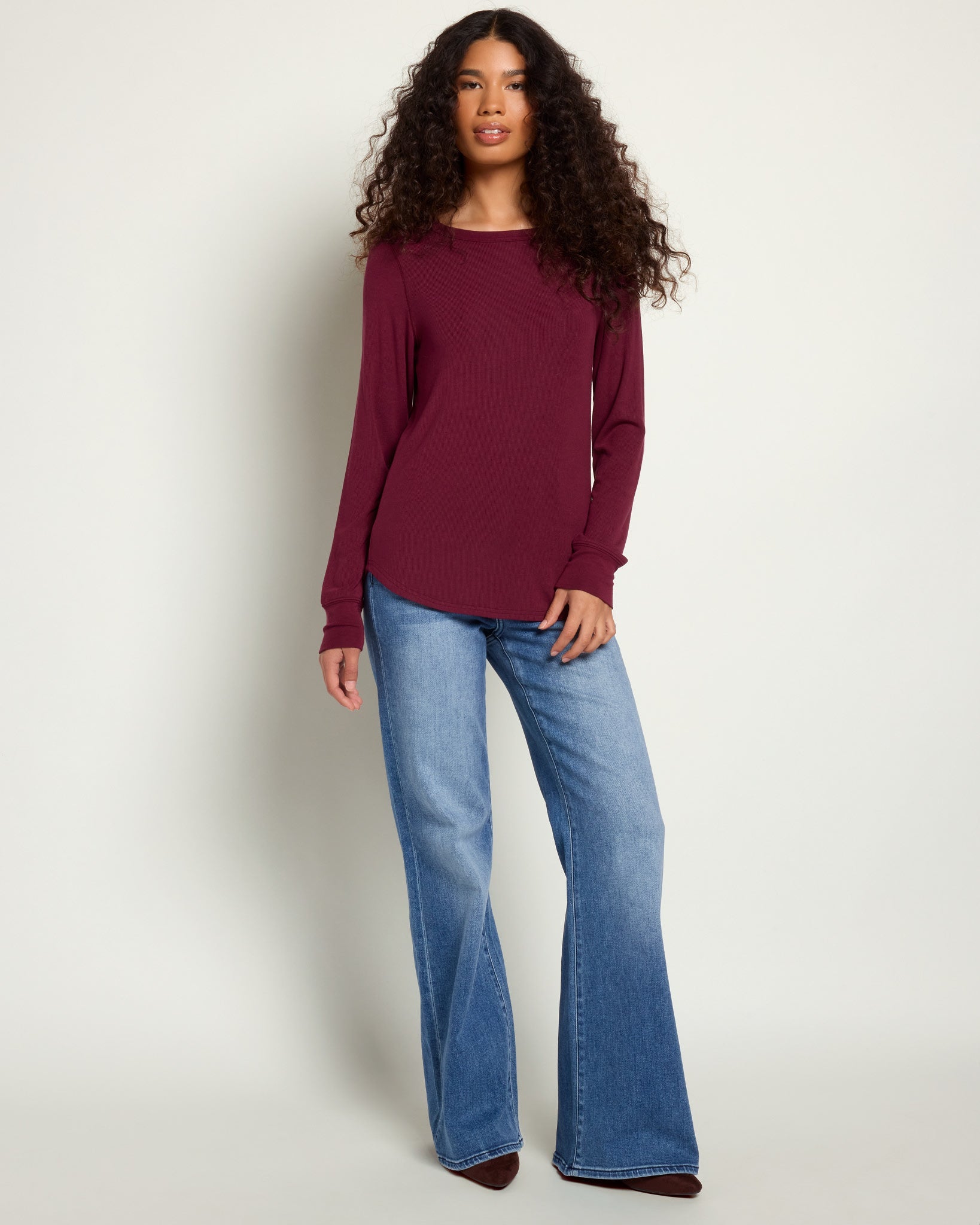 This long sleeve top will be your basic bestie! Relaxed feminine cut with a boat neck and curved hem. So-soft and stretchy in a ribbed knit that easily layers under your favorite outerwear.