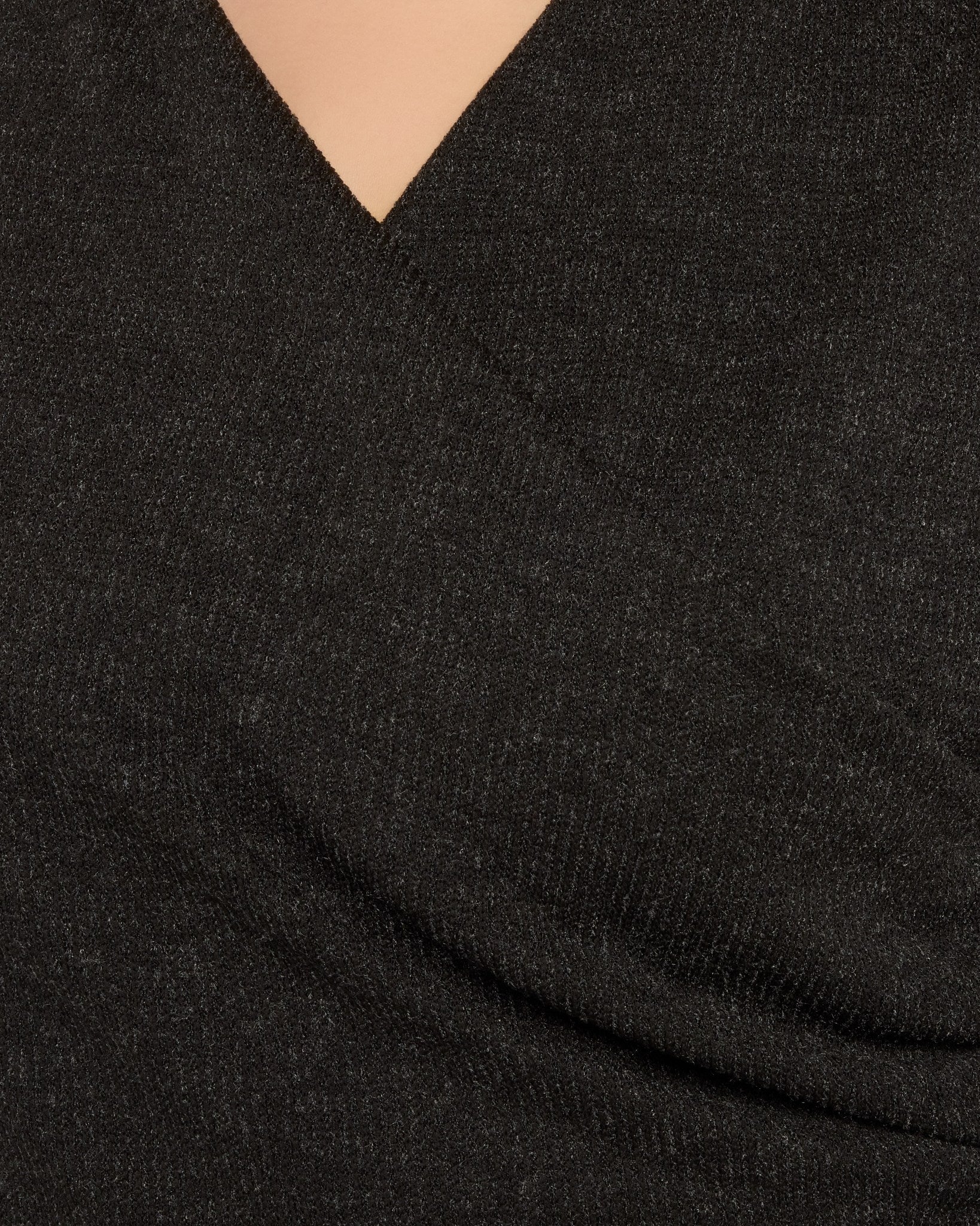 Every wardrobe needs a fabulous top that stands the test of time! This dressy top fits the bill with an elegant wrap style, luxe drape, and slim quarter-length sleeves. Looks great with slim jeans and over-the-knee boots.